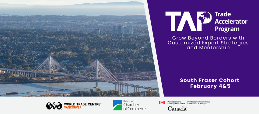 Note: Through the support of the Richmond Chamber of Commerce, eligible Chamber members may receive a full bursary valued at $5,000 to cover the participation fee for the Trade Accelerator Program (TAP) South Fraser Cohort, helping companies advance their export growth and international expansion.